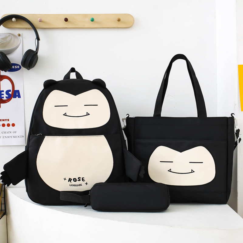 Ensemble de Sacs Snorlax 3Pcs Design Kawaii Noir – حقيبة مدرسية 3 قطع لون أسود