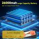 يأتي الكشاف مزودًا ببطارية بسعة 26000mAh، تُشحن عبر USB سريع (6-8 ساعات) أو بالطاقة الشمسية (في غضون 48 ساعة من التعرض للشمس). يوفر إضاءة تدوم حتى 26 ساعة بنسبة سطوع 50% أو 15 ساعة بكامل السطوع.