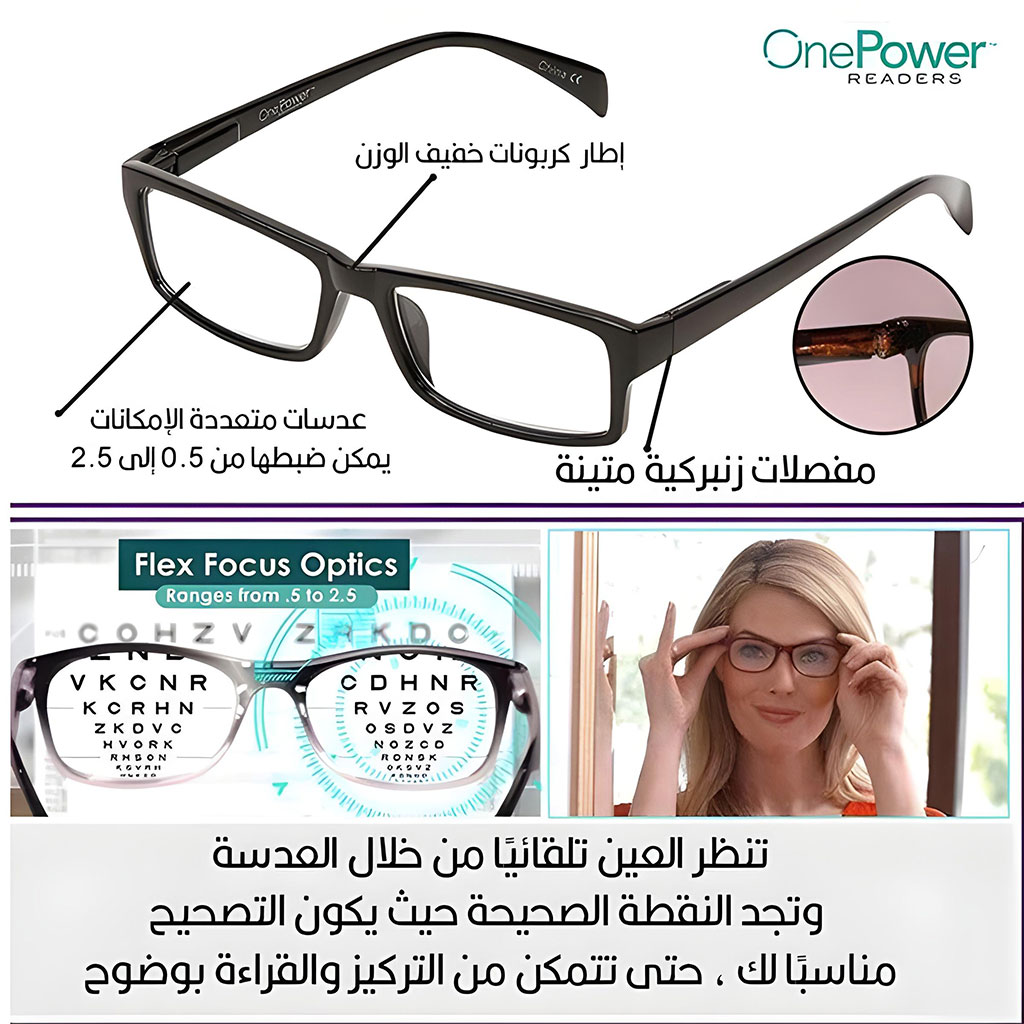 تكبير متعدد من +0.5 إلى +2.5 في نظارة واحدة.عدسات Flex Focus لضبط تلقائي للتركيز بما يتناسب مع العينين.مفصلات نوابض قوية ومتينة.مثالية لقراءة النصوص الدقيقة، شاشات الكمبيوتر، وتركيب الإبر.مناسبة للأعمار أقل من 65 عامًا.